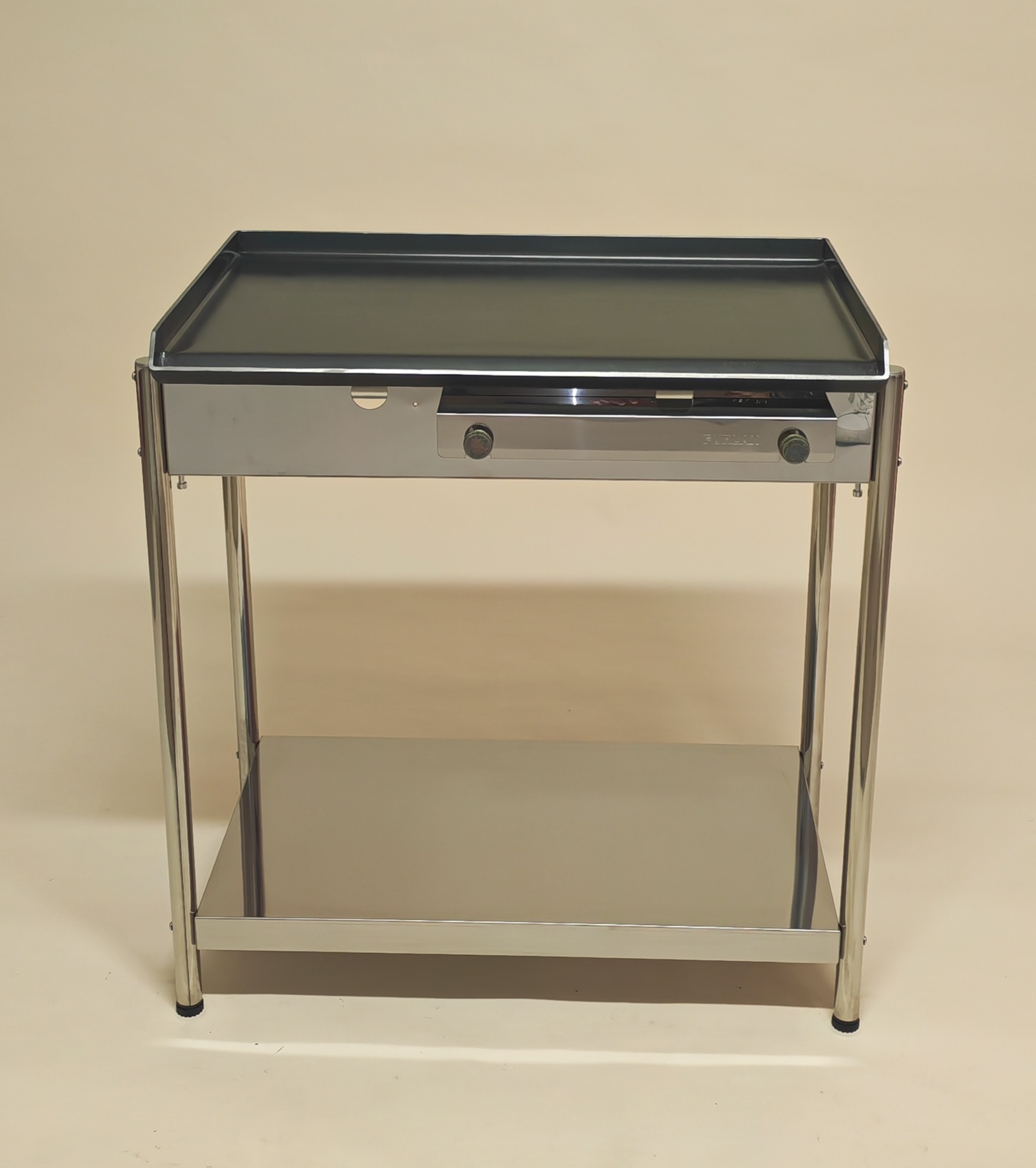Roštilj stoji na stabilnim inox nogama te uključuje donju policu, ki omogoča dodatni prostor za odlaganje pribora i opreme. Cjelokupna konstrukcija namijenjena je dugotrajnoj i intenzivnoj upotrebi.