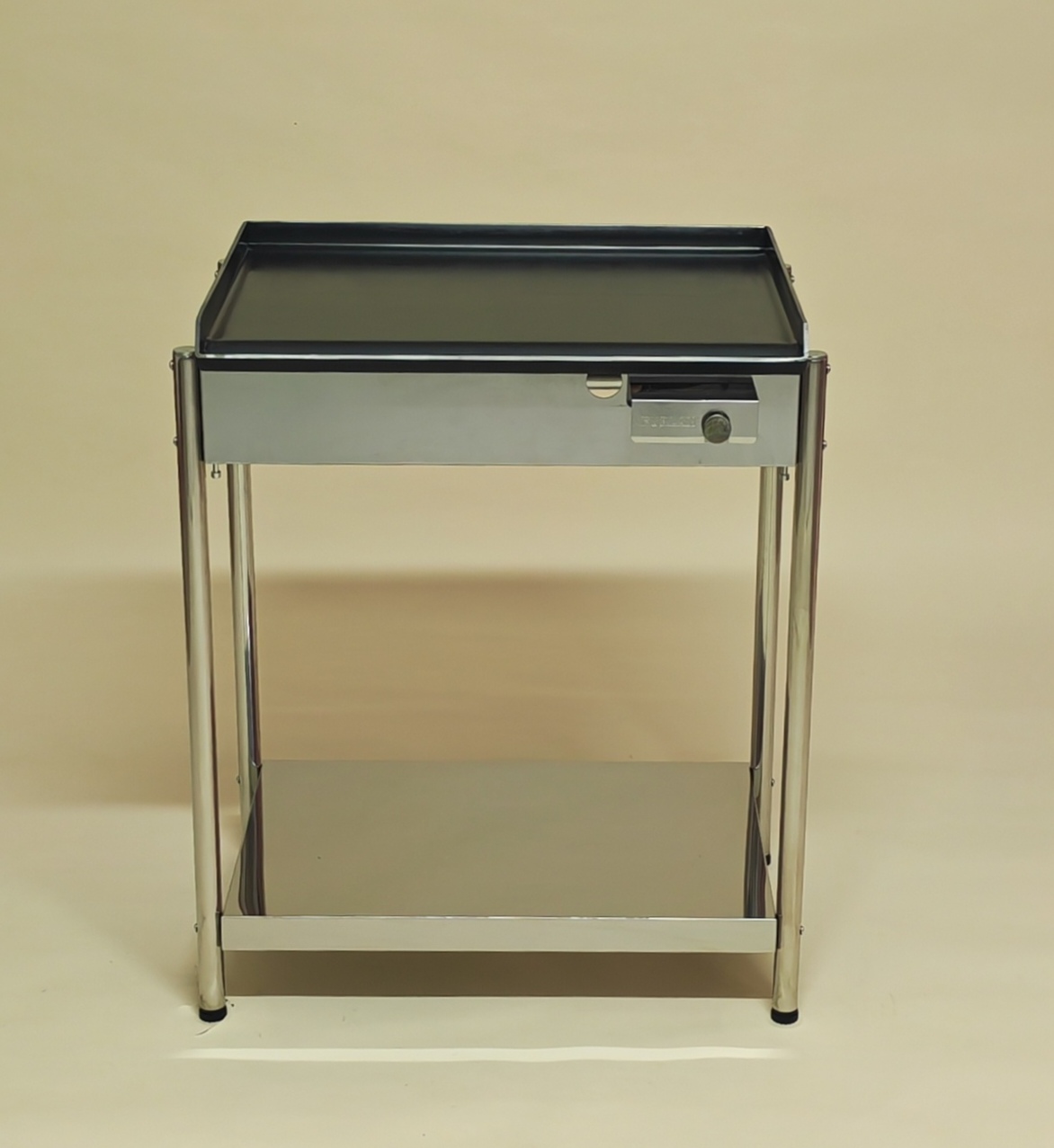 Roštilj stoji na stabilnim inox nogama i uključuje donju policu, koja omogućuje praktičan dodatni prostor za odlaganje pribora ili posuđa. Konstrukcija je prilagođena dugotrajnoj, sigurnoj i pouzdanoj uporabi.
